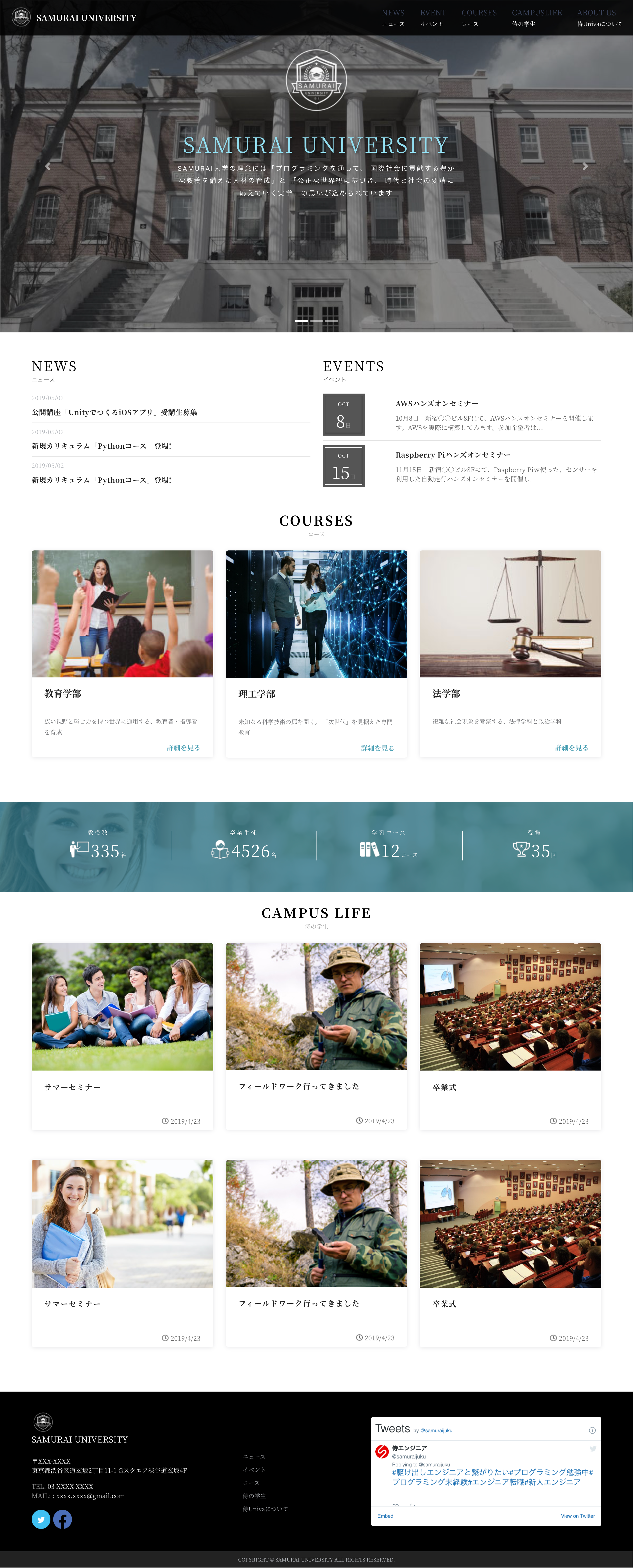 大学のHP 大学のHPを作成しました。 担当 デザイン・コーディング サイトの目的 大学の紹介 使用技術 WordPress/PHP デザインについて 同じようなデザインで学校機関や企業様のHPを作成することが可能です。 コーディングについて ブログのようにコンテンツを投稿できる機能を取り揃えています。 Works一覧へ